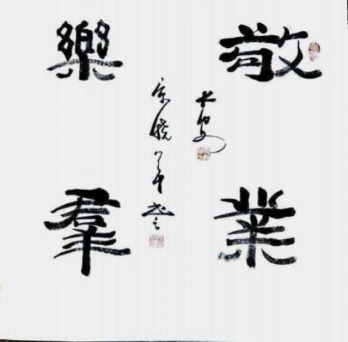 内容“敬业乐群”创作时间,2023 年 2 月, (斗方),规格,69cmx69cm , 书体,隶书。
