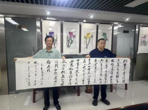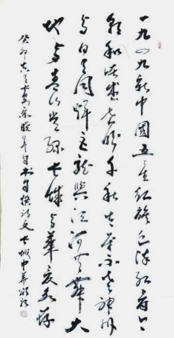 宋晓军自书自撰诗“长城中华颂歌”,释文:“一九四九新中国, 五星红旗血 染红。看今朝和谐盛世, 盼千秋太平不老。神州 与日月同辉,巨龙与江河共舞。大地与青山常绿,长城与华 夏永存。” 创作时间 2023 年 11 月,规格:138cmx69cm。